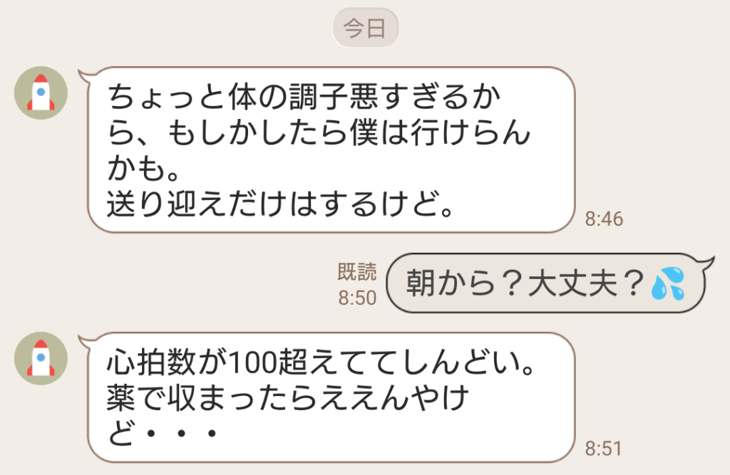 そのまま車で行く予定だったのに…。朝きたLINEがこれ。